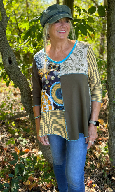 Description What a creative mix of colors and textures! Perfect top with jeans to take you into the cooler days. Jan is wearing a size medium.