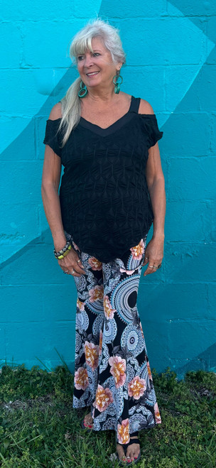 If you haven’t tried any HJ bells, now is the time ! Women come in the booth and say they are too short, too heavy or some excuse and I’m very bossy and make them try them on. Then they love them! I have on Mediums. Great weight and comfort for summer, especially paired with the Dancing Queen black top I’m wearing in Small and the Queen Anne Stevie Cardigan in Small. What a great trio for travel!