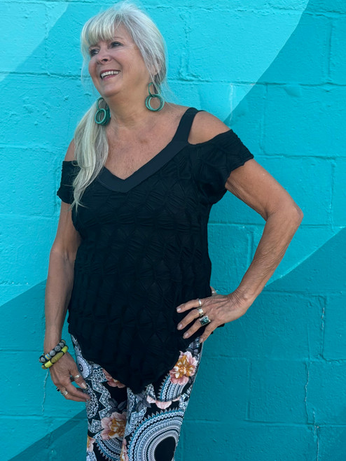 Description The flirty kiss top! So flattering and always a hit. Now in this amazing puckery black fabric. The point in the front and back is very flattering. Jan is wearing a medium.