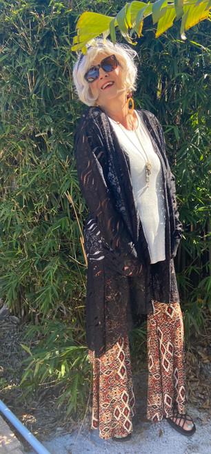 Another perfect companion for so many of your sleeveless pieces! Beautiful and sturdy stretch laces combine together on this beautiful cardigan. Designed to wear open or even draped over your shoulders. Packs beautifully and washes easily. You'll love this popular piece!